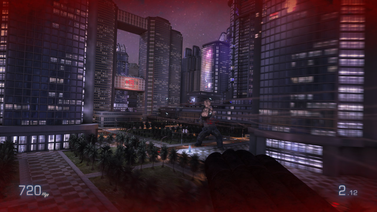 The game proper is based around racking up points with creative and skillful kills, and you get the tools for it. While the main arsenal is pretty standard (machine gun, a very good shotgun, handcannon, rocket launcher, ect), there are some fun flourishes. For example, you cannot shoot the sniper rifle in scoped mode without having a target highlighted by its interface, and then shooting slows time down so you can guide the bullet to the target or a completely different enemy (which can net a unique points bonus) a la the 2008 film Wanted. All weapons can also eventually get charges, special alt fires that usually hit harder or with a violent extra touch, like shooting flares that explode after a few seconds, or having remote detonation exploding bullets.