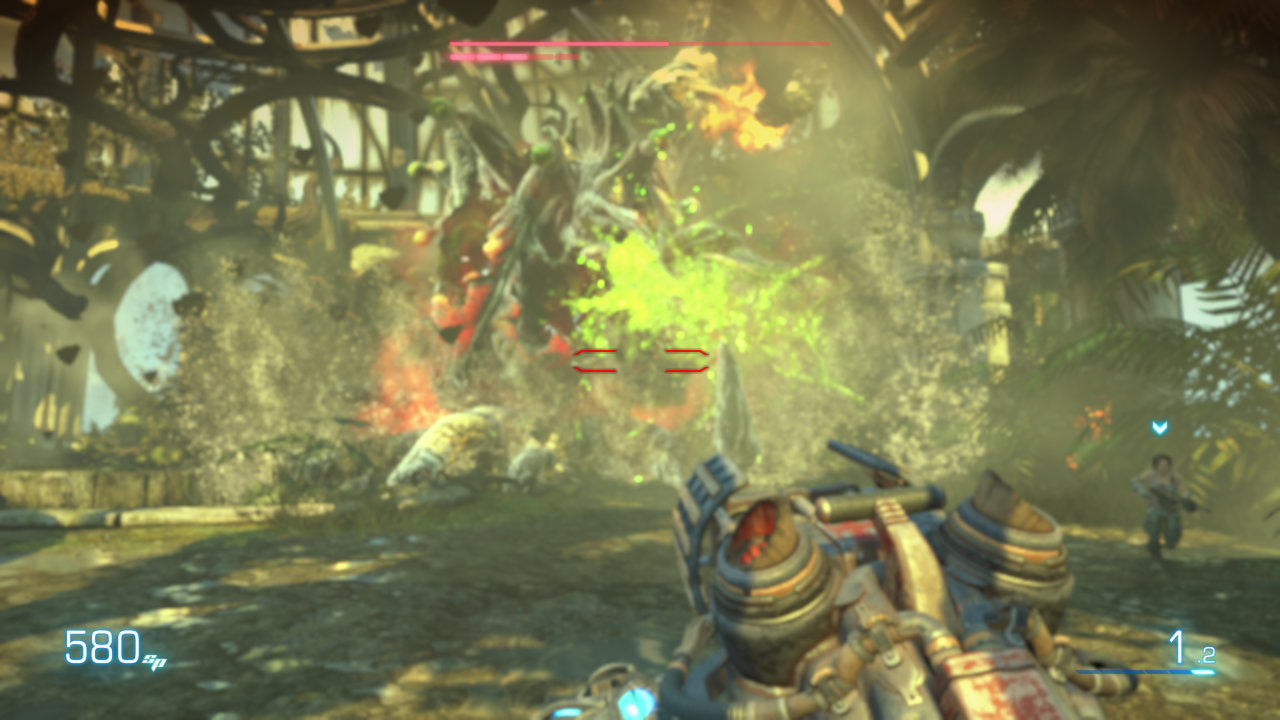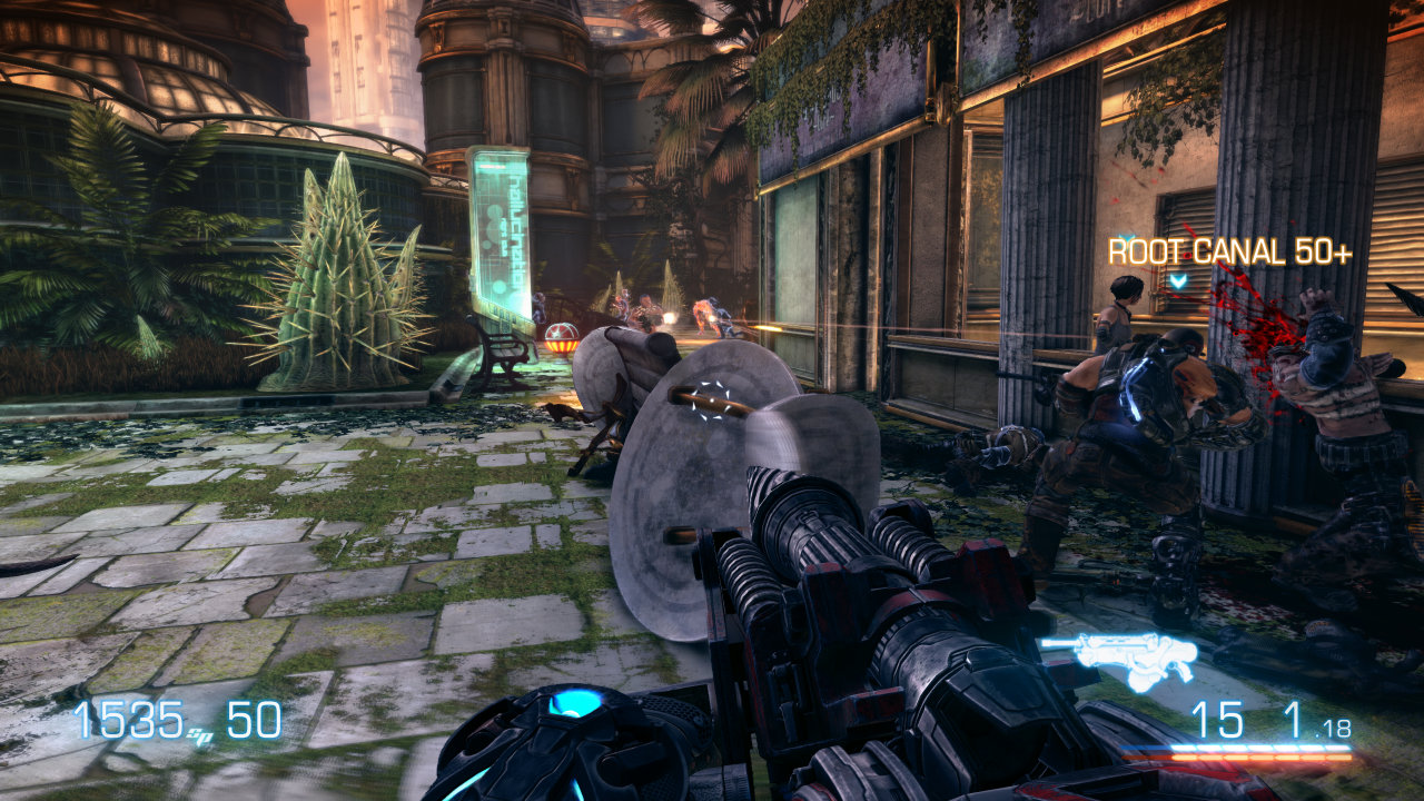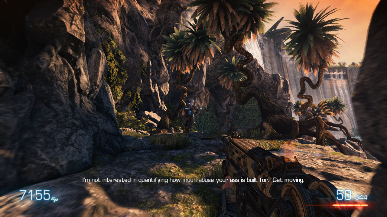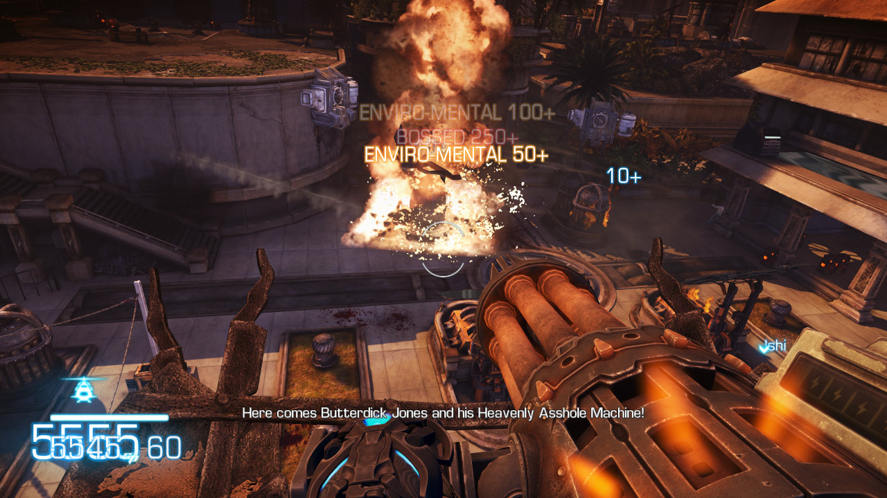 When the game clicks, it’s a blast of chaos, wacky score titles popping up alongside explosions, gore, and gunfire. It’s quite thorough too, with points bonuses for the killing shot being in the butt, the crotch, managing to juggle, various environmental kill bonuses based on how the effect is activated, and so forth. The final stretch is some A-class FPS stuff just in terms of what fun you can have from your box of toys. The issue we run into is that Bulletstorm feels scared to fully be itself. If by publisher meddling, questionable creative direction, or some other unknown set of factors, the classic send up ends up using a lot of then modern FPS mechanics, and they clash against what the game is going for more often then not.