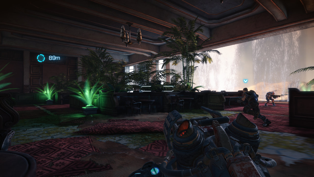 The real star is the leash, an energy whip like thing that you can summon from a device you get early in the campaign. It’s main use is drawing in enemies, which keeps them in a slow Dead Space style stasis for a short bit, long enough to set them up for stylish shooting or cruelty. You can also use kicks and a very fun slide kick for the same effect, all useful tools for knocking enemies into hazards, keeping up momentum, or setting up more complicated punishments.