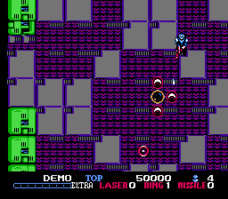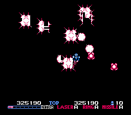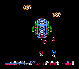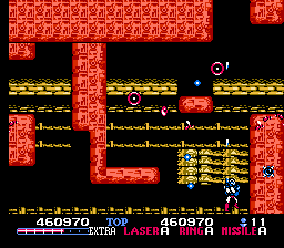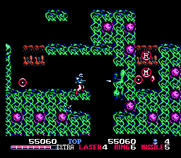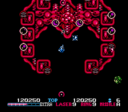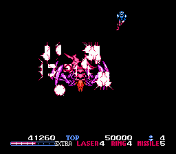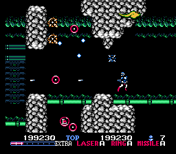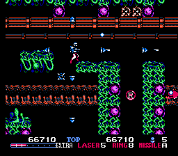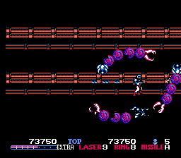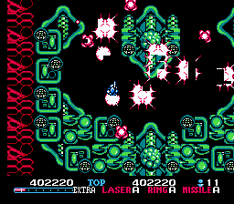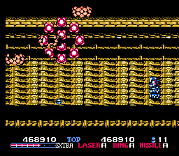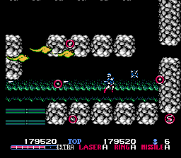 You find lots of power-ups that flash between “L” (Laser), “R” (Ring), and “M” (Missile), each granting different boosts to your firepower. The Laser replaces your main gun and acts like the classic Gradius laser, the Ring is fired in tandem with your gun and can pass through walls like the Metroid Wave Beam, and the Missile keeps firing to the right no matter what, like the machine gun in Jackal. If you manage to collect five power-ups of the same type (your count is handily denoted in the lower-right corner), you can also fire your sub-weapon projectile simultaneously behind you. Collecting ten of a power-up fires four projectiles at once, with the Ring shooting a spreadshot, the Missile firing in a constant cross pattern, and the Laser shooting diagonally of your current position which oddly restores your main gun instead of having the Laser overtake it. Getting killed causes the counter for the weapon you were using to reset to zero, though the other two weapons still retain their power levels. Enemies sometimes give off floating gems when destroyed, and collecting enough allows you to drop a screen-clearing Cobalt Bomb. Holding off on using bombs and letting the bomb meter completely fill up actually nets you an extra life. You’ll also find speed-ups and a rotating pod which causes additional damage to enemies in close proximity.