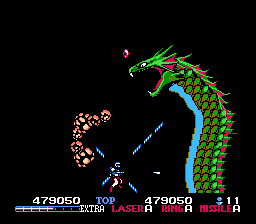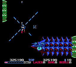 Most of the levels play out as sidescrollers where you go in all sorts of different directions and try not to die against the many flying enemies, turrets, and stage hazards littered about. If you fly around and explore every potential nook, the screen actually scrolls in a different direction than usual and reveals some bonus items that normally would have gone unseen. The manual encourages you to find as many of these “hidden rooms” as possible, and since you don’t blow up on contact with walls, try searching for them when you aren’t mobbed by Burai fire. The end of the normal levels pits you against large bosses with names equally awesome and audacious. The large spider-crustacean thing with rotating tentacles at the end of level one is apparently named the “Giganticrab”, and the dividing worm boss of level two is the “Jawsipede.” The bosses provide fair challenges as they have some tricky attack patterns, but you can shred most of them apart in seconds if you aim true and have a powered sub-weapon. The only one who takes a long time to beat is the final boss, which just so happens to be that rad dragon on the cover art.