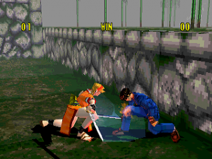Unless your current stance leaves you wide open, a single hit to the head or body will usually clash against the opponent’s weapon by default; in order to score a fatal hit, one must either strike at the right moment ? right after dodging or parrying the opponent’s attack, for example ? or perform an attack chain that will first move his or her weapon out of the way, then hit the newly-exposed spot. As one character puts it in one of his endings, swordsmanship is about timing, not power. Another tactic is to maim the enemy, so as to impair their capacity for fighting. A clean hit to the legs will bring them down on one knee, limiting their movements and leaving their head exposed to overhead attacks. A fighter in this position has a variety of offensive options nonetheless, including a desperate lunge that can prove deadly. Injuring the opponent’s arms slows and weakens them, on top of stopping them from using certain moves requiring two hands. Similarly, each character has a sub-weapon, which can also be thrown; the weaker types are used to create an opening, while others are heavy enough to kill on their own. Once they hit the ground, either fighter can pick them up to throw them again.