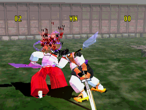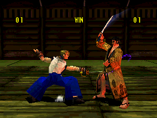 While 2-player VS. is the heart and soul of any fighting game, Bushido Blade’s single-player modes are worthy of mention. Slash mode works as a nice little side-game of its own, teaching you how to deal with specific stances and attacks, as you fight 100 ninjas whose patterns change with every group of 10. In the original version, it was known as Chambara mode; Chambara is the name given to sword-fighting movies in Japan. Practice mode lets you fight continuously against a CPU-controlled opponent using a bamboo sword, though you’ll have to go back to the manual (or the Internet) for a movelist.