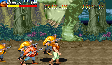 You battle the Black Marketeers over eight stages, beginning at the top of the City in the Sea, beating up grunts before facing down Vice Terhune after he turns an enraged dinosaur on you. From there, it’s a trip to the Swamp Forest, battling poachers while waist deep in water, and taking on The Butcher, a brute with a skull necklace and two machetes. Stage three shakes things up, as you jump behind the wheel of a Cadillac down Hell Road, an auto-scrolling section where you mow down gang members, crash into barrels Starsky and Hutch-style, and try and rear end Hogg, a biker astride a colorful Harley, while he lobs grenades at you. If you don’t end the fight there, you’re left on your feet while Hogg flies across the screen in different directions, and grunts move in from all sides.
