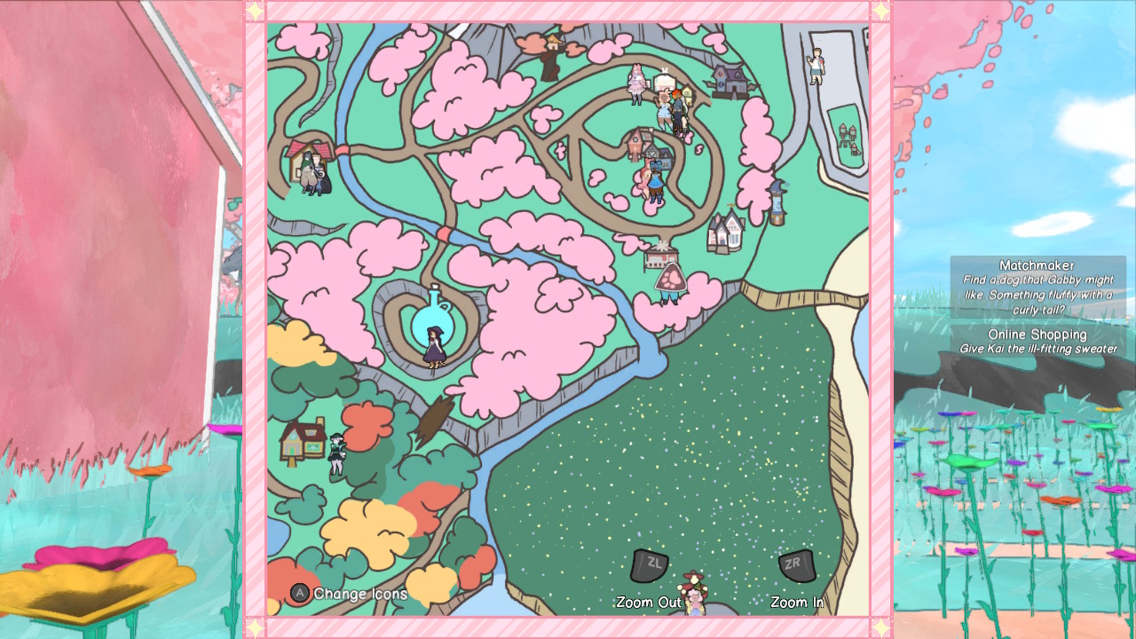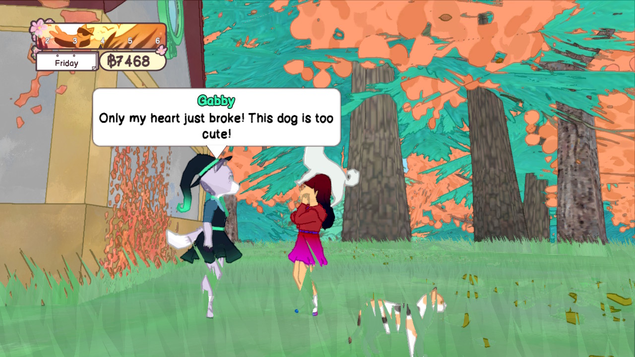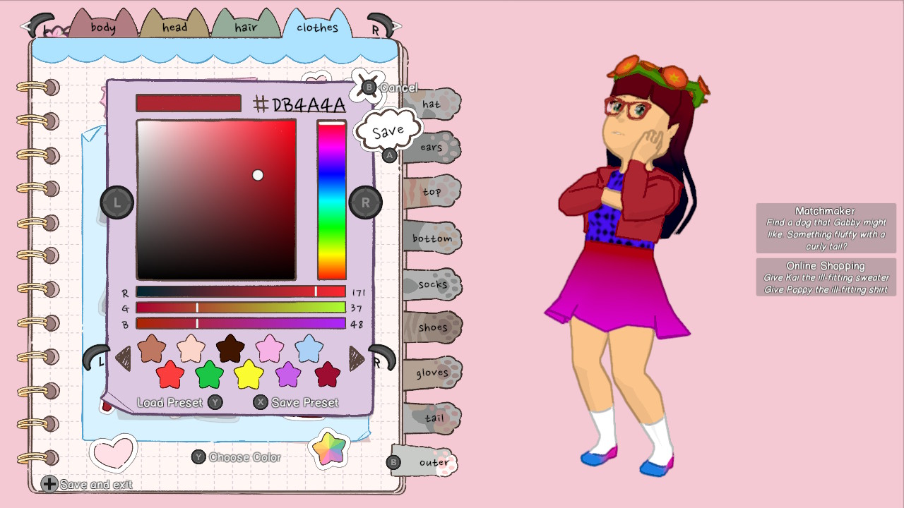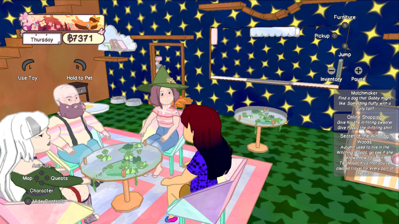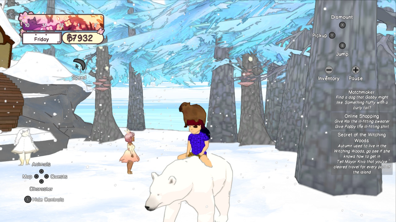 The menu system is not intuitive. It lets you look at your inventory, check a map, look at a list of all the characters and how much they currently like you, look at which animals you’ve interacted with so far and their current status (staying at cafe, following you, or free in the wild) and even change that status (e.g. commanding an animal who’s staying in the cafe to seek you out and follow you instead), and check your quest list, but navigating these menus can be tricky to figure out. Quest reminders must be manually turned on, so you don’t forget what you need to do in order to progress. The fact that you press a button to bring up the color change menu for hair/clothes/furniture isn’t immediately apparent either. Some parents might need to help their kids with the menus.