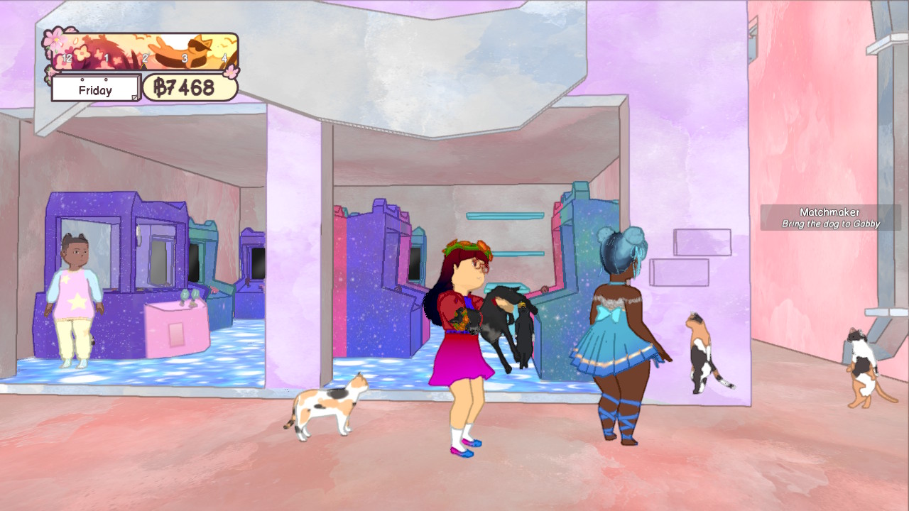 The big city area feels rather empty for what’s supposedly a bustling and busy city, though it does actually have dozens of citizens in the form of cats that walk on their hind legs, and only a small number of humans. When you’re inside a building, ceilings and walls vanish to make it easy to see where you are, which is very useful, though it looks a little weird in practice. Characters talk about things they’re planning to do – go on a date, do a photoshoot – but are never seen doing them. Instead, they simply walk from place to place. A few characters are at least seen doing animations for things they’re interested in, such as planting flowers or dancing.