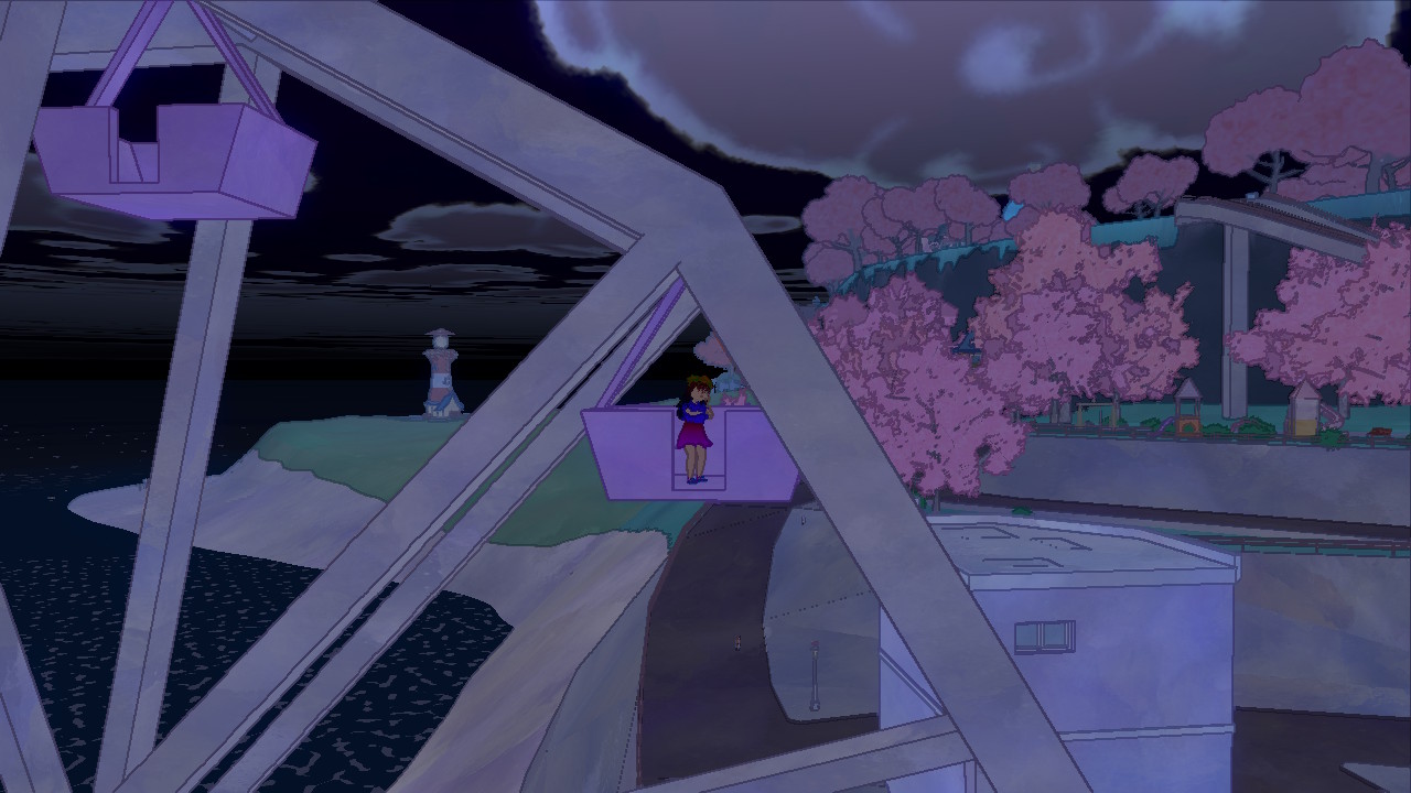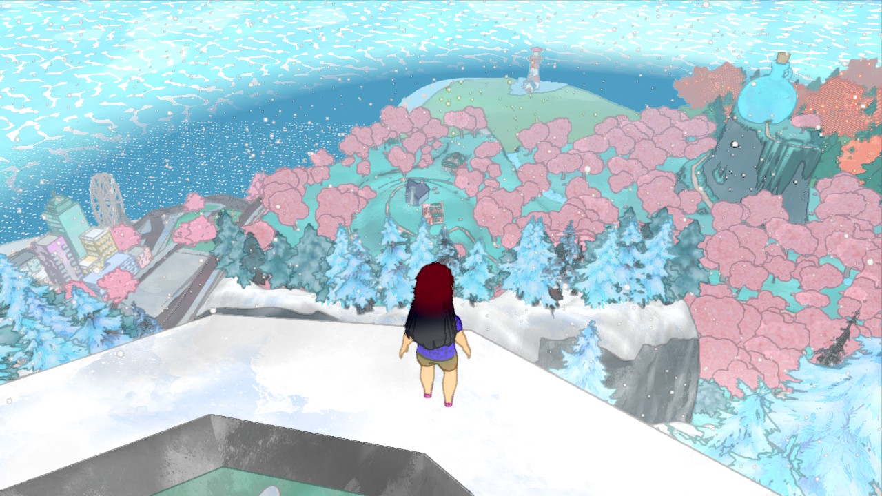 The art direction of Calico is very distinct. Every area has a strong visual identity, from the whites and light blues of the snowy mountain, to the green and orange leaves of one of the forest areas, or the pink leaves of the main town, or the tall buildings of the city. Pastel hues abound, resulting in a larger contrast with colors that are designed to stick out, such neons. What Calico lacks in budget and polish, it makes up for in imagination and interactivity.