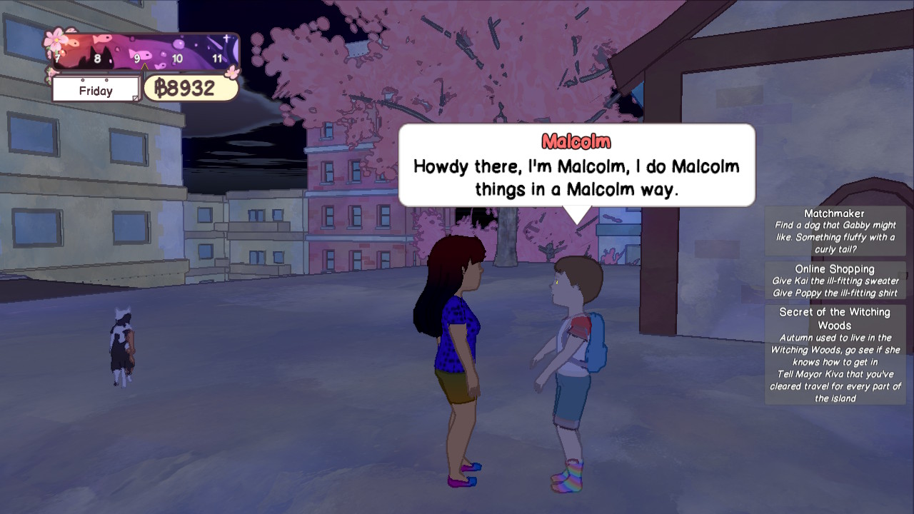 Despite the lack of polish and feeling unfinished even with the updates, the game just oozes a distinct charm. The townspeople are incredibly diverse, and even include some part-human/part-something-else creatures. The world feels fairly alive, with moving clouds, changing weather, a day/night system, and people moving around and visiting each other and stopping by your cafe. The mood seems to be one of a largely conflict-free, very chill world, where everyone just accepts each other and has only minor problems in their lives. The worst of their problems seem to be “I accidentally turned one rabbit into seven rabbits while trying to make a rabbit rainbow colored” and “a giant cat is stuck in a log, so I can’t go to the forest.”