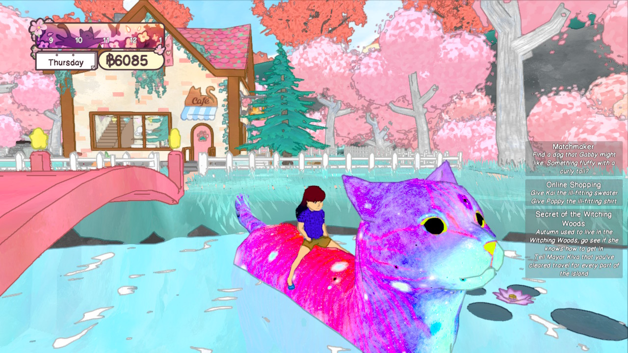 Calico is a game where you put a cat on your head, then cast a spell to enlarge a capybara so you can ride it, while having an enchanted shrunken polar bear float behind you like a balloon while you’re carrying a deer. Ostensibly, it’s about running a cat cafe, which is a cafe where cats and other adorable animals hang out while people come in to buy food and chat.