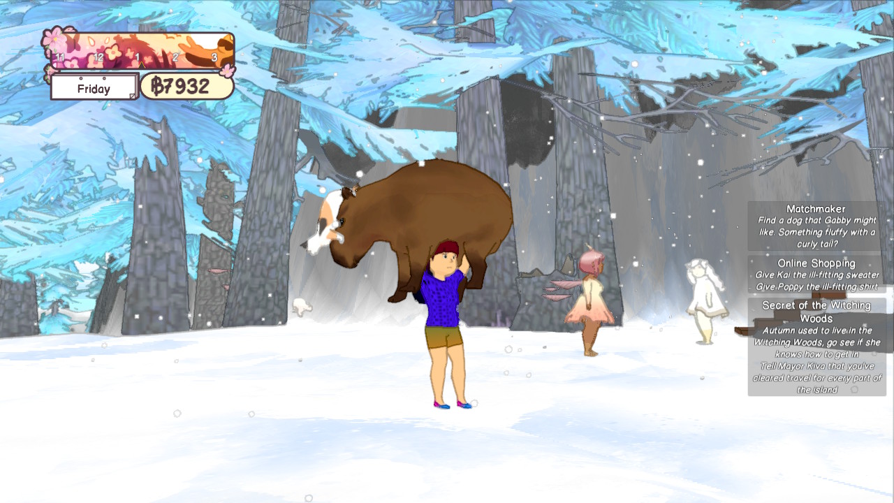 The main reason to do the game’s objectives is to earn more of these things to goof around with. Earning more recipes to cook more foods, earning the ability to go to other areas, and getting new furniture sets unlocks more things to do and interact with. The game may appear to be open world, but areas are blocked by both invisible walls and visible obstructions such as road cones or a giant cat stuck in a log, until you’ve unlocked that area. As areas open up, the world becomes more open. Completing the game even earns you the ability to fly everywhere on a broom!