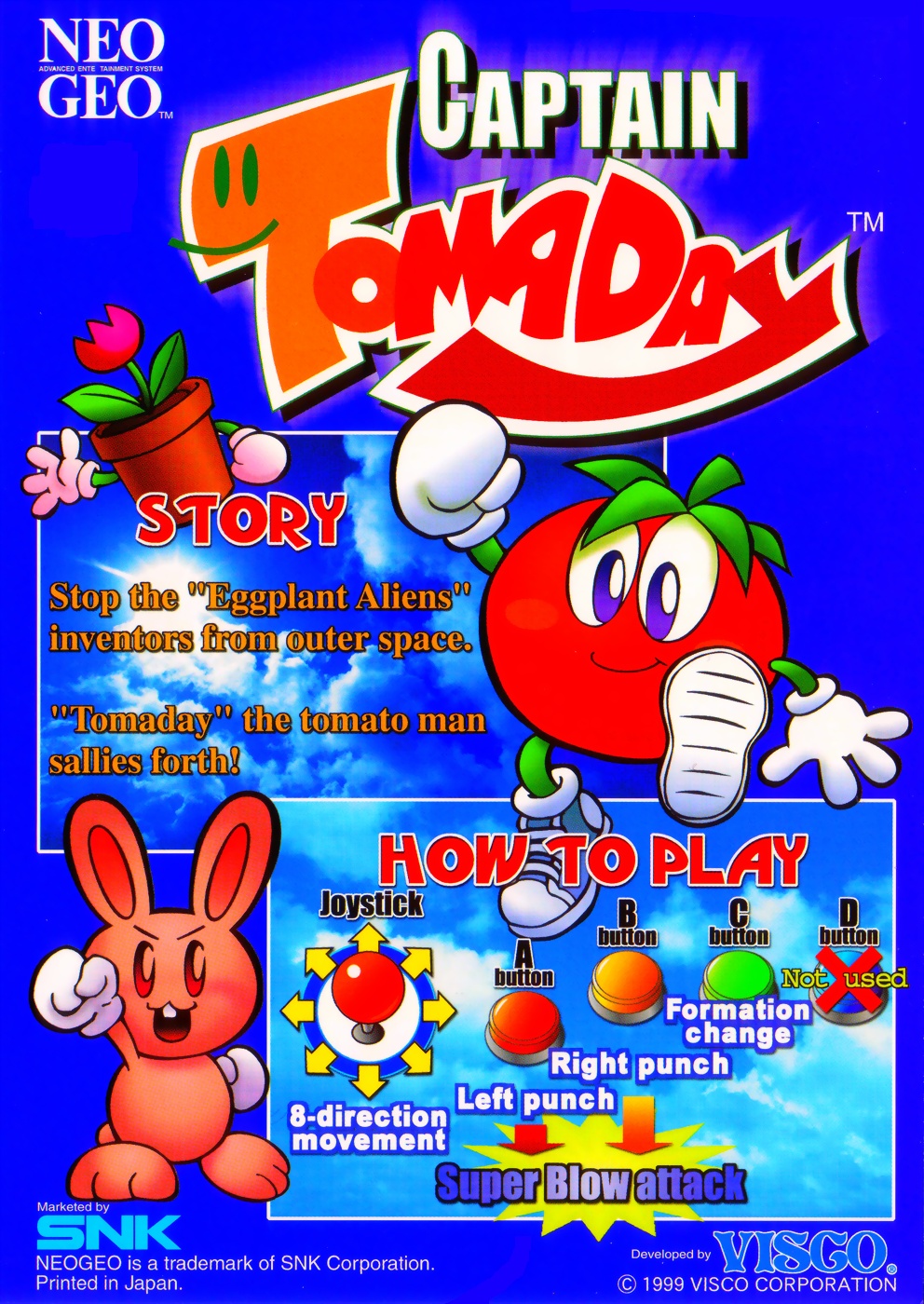 The titular tomato in Visco’s Neo Geo shoot-em-up must traverse five levels that have baddies coming in all sorts of waves. However, what sets Captain Tomaday apart from most shooters is its method of attacking. The A button makes Tomaday’s left fist shoot, and the B button fires his right fist. Both fists can be fired simultaneously or one at a time. Attacking with one fist for a while makes the other grow in size and power, eventually turning Tomaday’s other first into a 1-ton weight which does more damage than the usual fist. Tomaday’s fists return to him as soon as they hit something, and this creates a risk vs. reward factor in taking risks and getting close to an enemy to take them out quicker versus taking them out from a distance even if it will take longer.