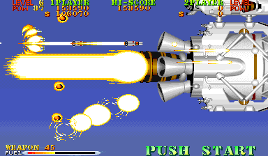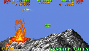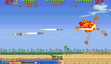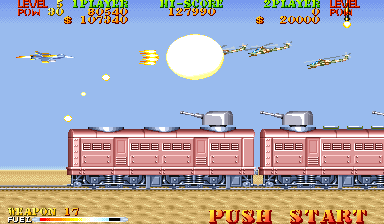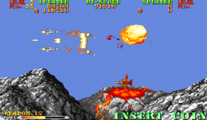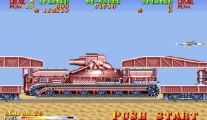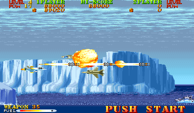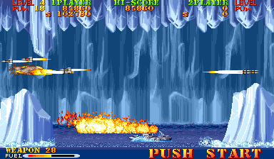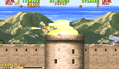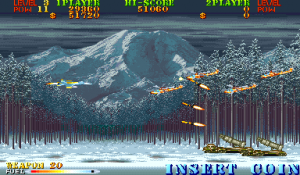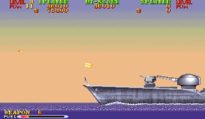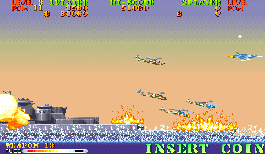 New to Carrier Air Wing is a cycling power-up system. In addition to leveling up the weapon being used, the POW-ups will cycle between blue, green, red and back to blue (in that order) with very colorblind unfriendly shades. The blue weapon provides forward firing rockets that hit hard and puncture through weak targets. Green grants a vulcan cannon similar to Area 88’s. Lastly the red conveys a bizarre clustered spread-shot that is heavily limited by pellet count on the screen. While this would arguably provide more variety and strategy to the game, in practice the best weapon is the Vulcan which is the favored weapon of the Hornet. Between that and never having bad auxiliary options there’s no real reason to use the other planes. Other new functions are a fuel bar that constantly drains a la the preceding 194X series and a bonus for killing all enemies in a level, which is not a static number. Considering that bosses have squads of four that reinforce for the entire duration of the battle, it’s easy to get cheated out of this bonus by killing the boss just as they spawn off screen.