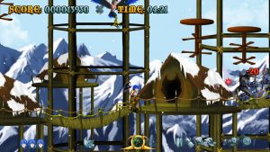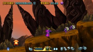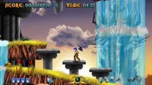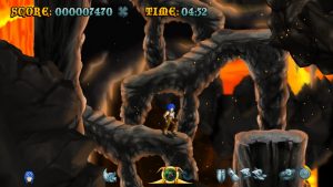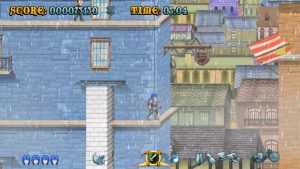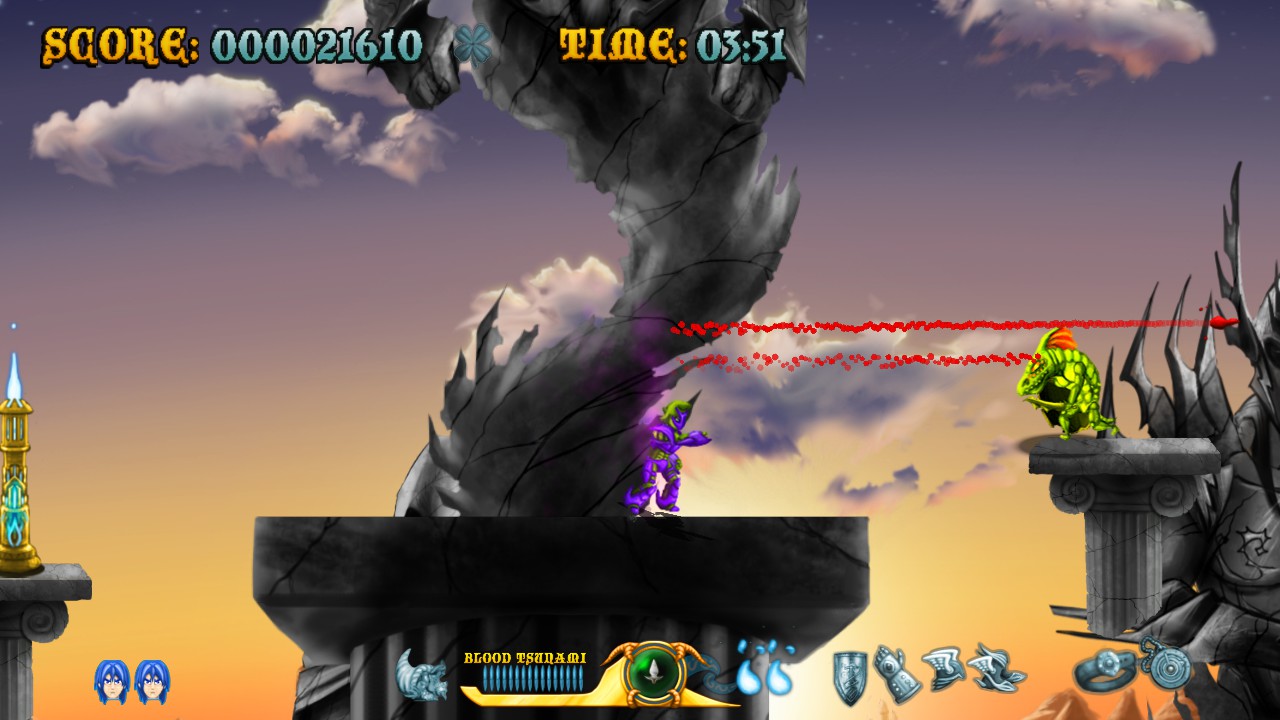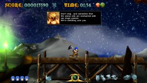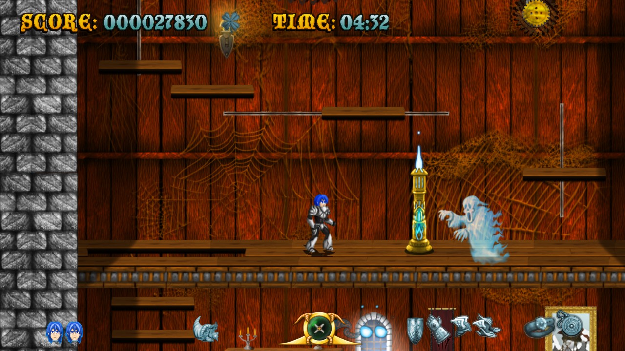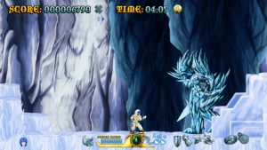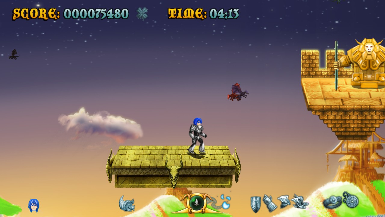 Raven Travel Studios was founded in 2011 by three people (programmer, artist and music composer) from Italy’s indie gaming scene who grew up on action platforming coin-ops and old-school anime; they went on to produce their first title, Cast of the Seven Godsends, as a homage to those sources. CotSG‘s demo was made available on Steam, which eventually hosted the complete game in Summer 2015. It draws lots of inspiration from titles like Rygar, Magician Lord and especially the Ghosts ‘n Goblins series: the crux of the gameplay is a magical armor, the level settings (including the obligatory “lava area leading to a snowy one” part) are mostly lifted from Ghouls ‘n Ghosts, as is the weapon system including charged attacks.
