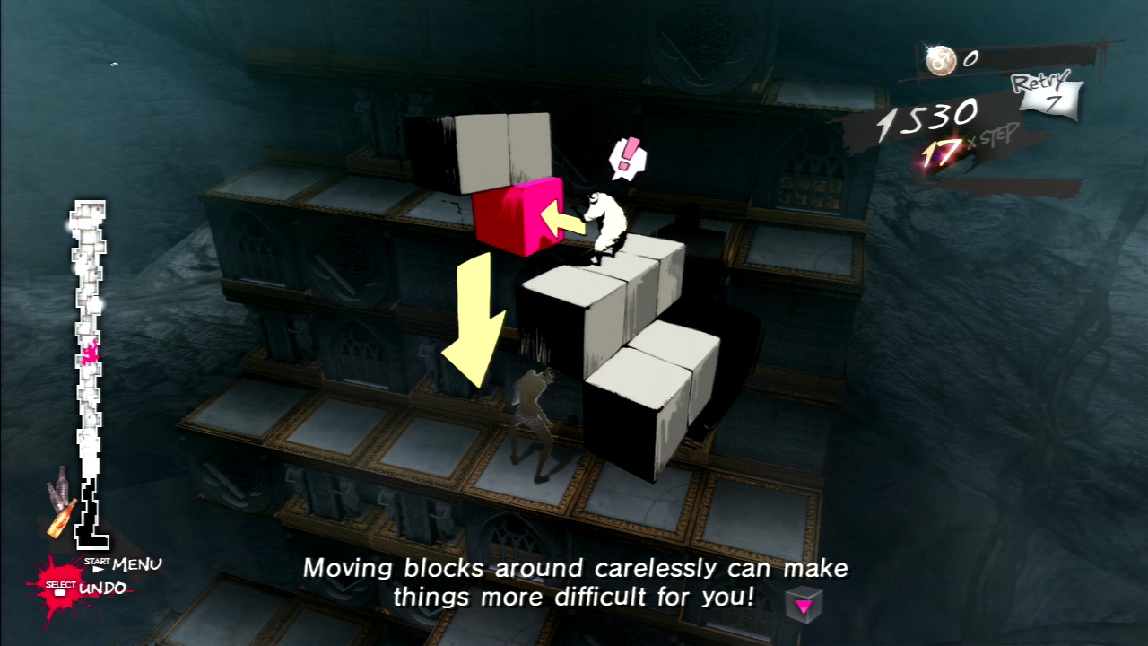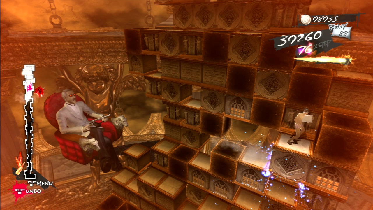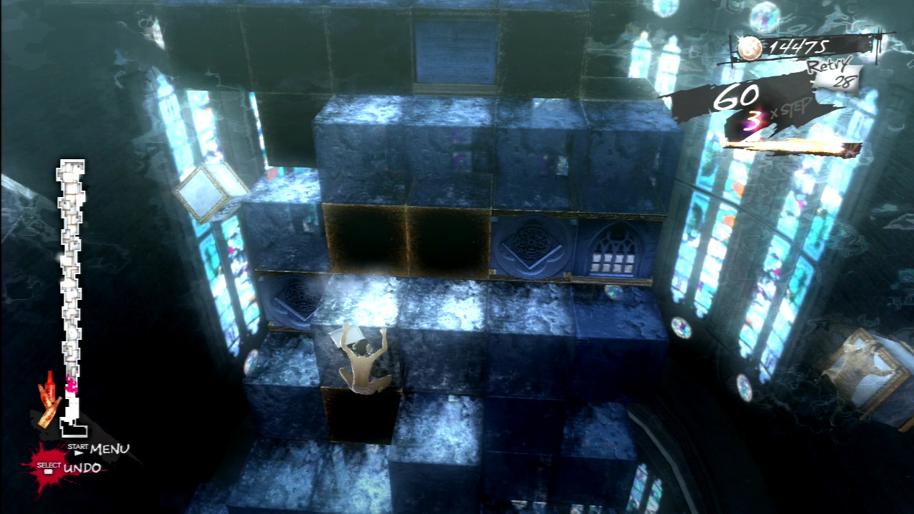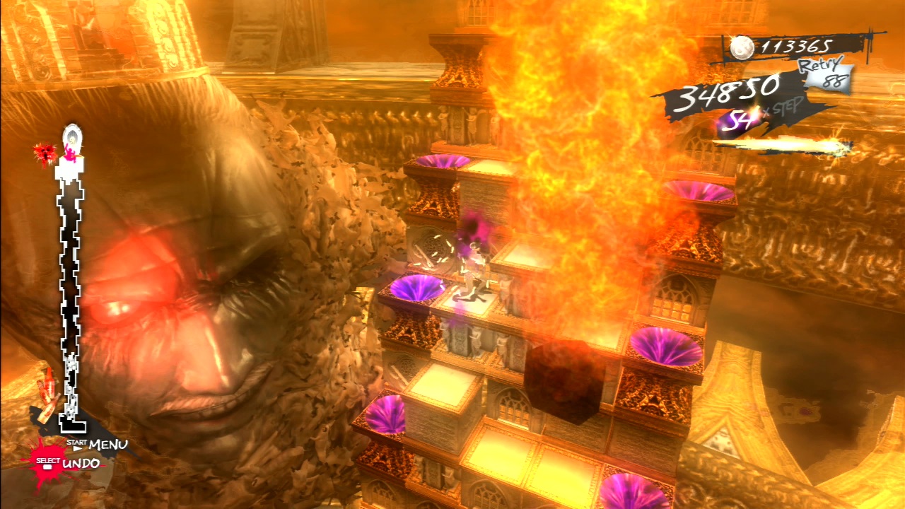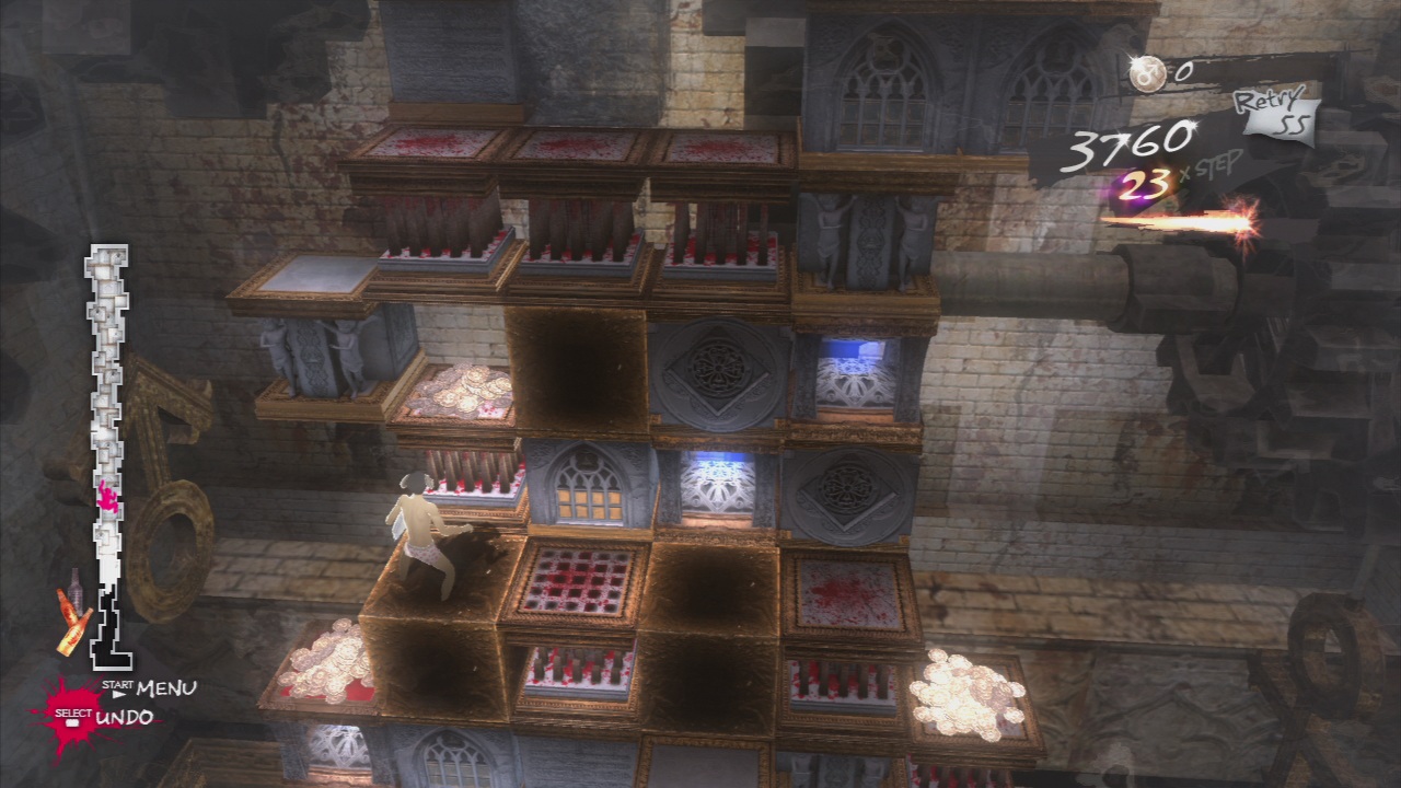 Death is, of course, fairly common – fall off the tower and you’ll fall helplessly to the ground and splatter on the ground, accompanied with dramatic music and the famed phrase “LOVE IS OVER”. The game is fairly generous with failure though, as you get a large number of lives to start off, there are regular checkpoints, and you can undo your moves by hitting the Select button (though while Vincent’s moves may be reversed, it doesn’t hit rewind on the collapsing of the tower, so you can’t abuse it regularly.)