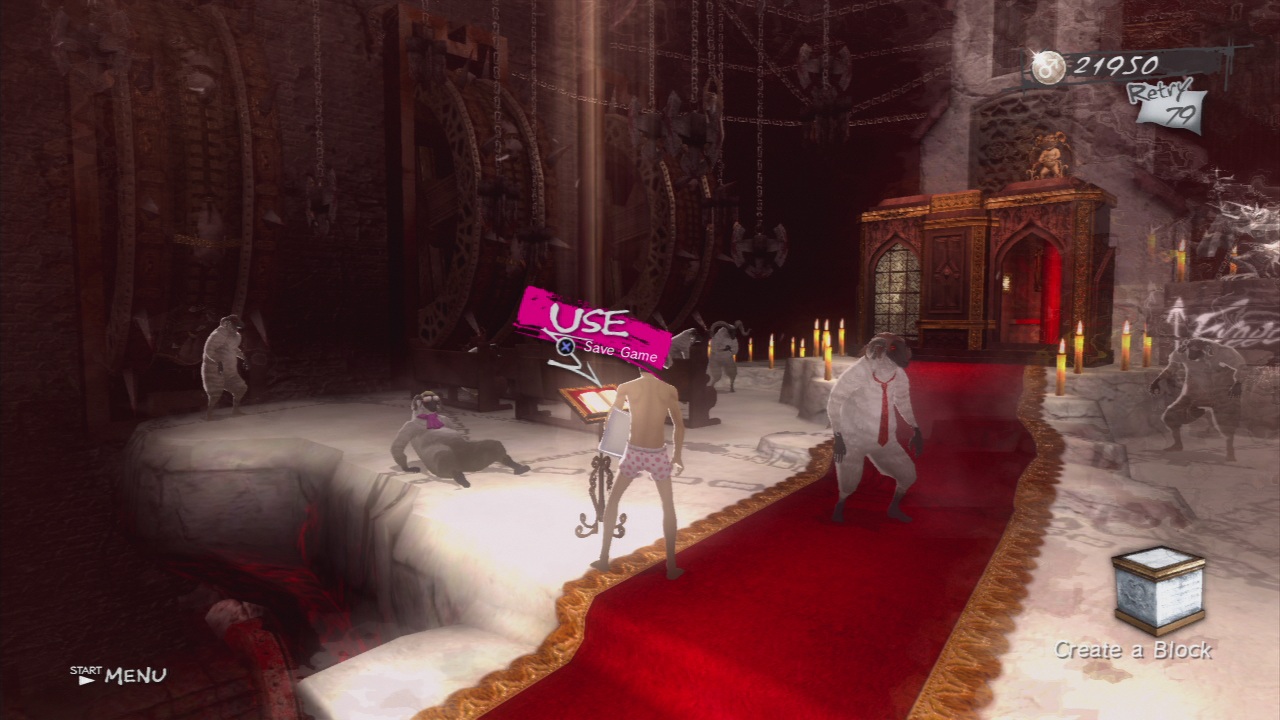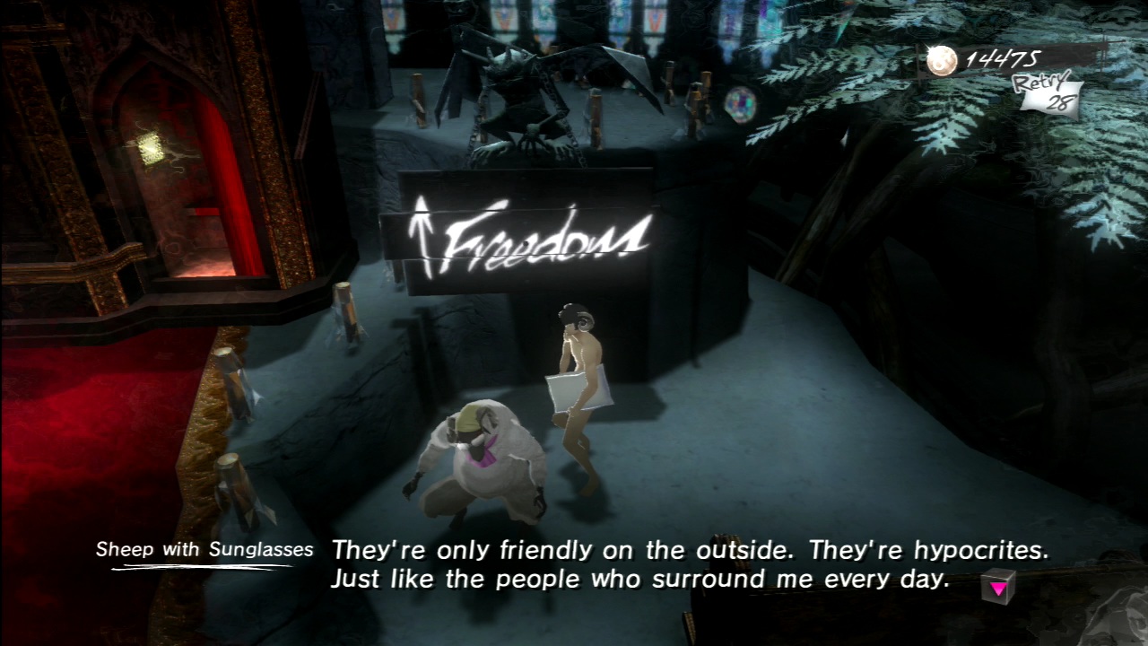 But if Persona empowers its protagonists with powers just as fantastic as the worlds they navigate, then Catherine disempowers its cast with crushing reality. (It helps that what Vincent sees in his nightmares never quite stays in his nightmares. It’s unsteady, always threatening to leak out into the real world just a little bit.) Judging the situation as a player, there’s very little hope that Vincent or any of the other sheep in his nightmare will ever learn their lesson. They interpret others as sheep because they want to think of themselves as the only true individuals, unaware that this is how all the other sheep see the world. None of them confront their own aimlessness or think that other people can provide a solution; their focus on survival is too provincial to allow that. All are in need of guidance but few are willing to accept it.