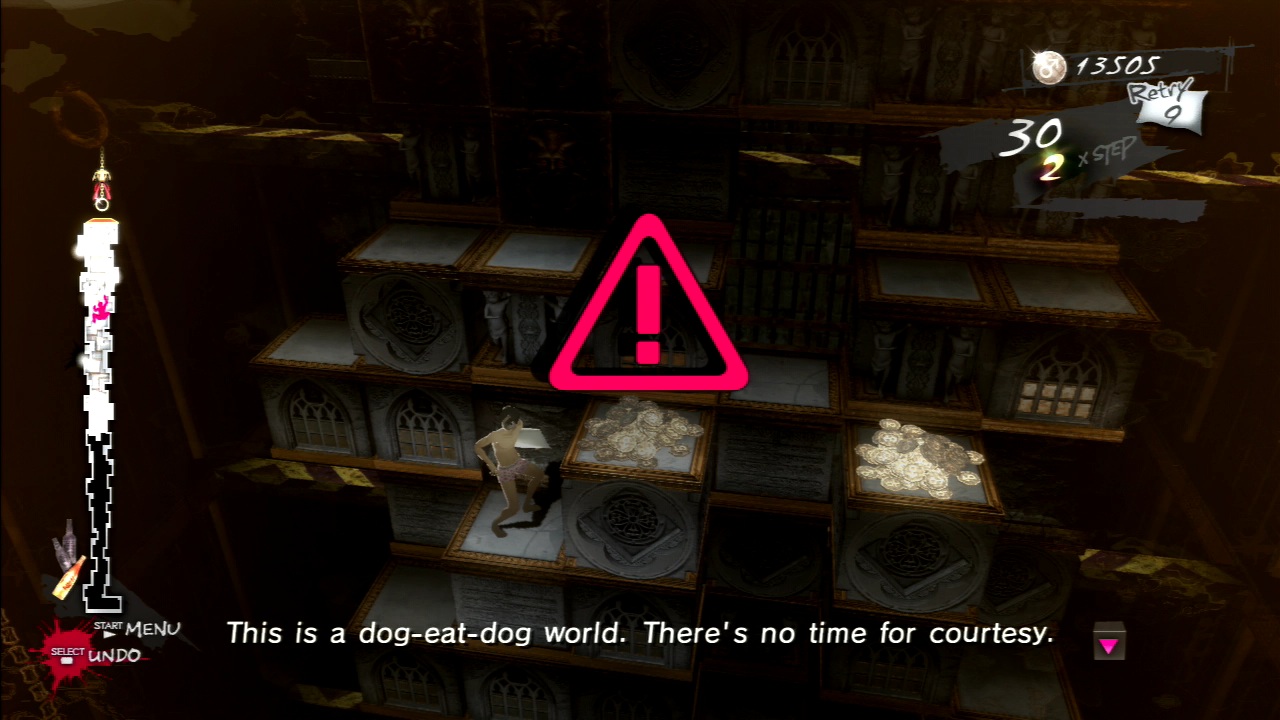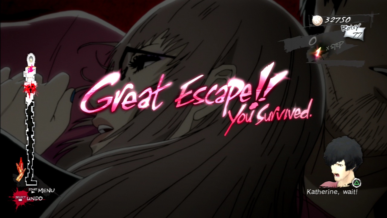 From a narrative standpoint, they put the player at a noticeable distance from the action, and in doing so, force them to consider the issues being discussed more deeply. Much of the story is a tragedy with Vincent playing the role of tragic hero. From the start he’s doomed to give into those vices he can never fully overcome. If the player is looking to fix Vincent’s problems once and for all, then they doom themselves to struggle in vain against his worst impulses. Instead, Catherine presents Vincent’s story as a sort of lesson or warning to the player: do not repeat his mistakes. “You are in a position to avoid these problems and fix your life”, the game says. “Don’t let that opportunity go to waste.”