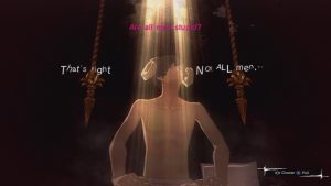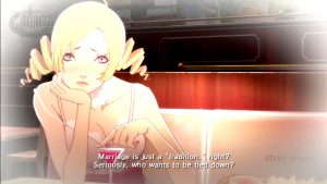 One could argue that while the characters might see things this way, but the game itself never adopts such a perspective, and it’s an unconvincing argument for a number of reasons, primarily because the characterization and plot all reinforce that position in subtle ways. Particularly, in spite of his flaws, Vincent is still presented as a hero and the women in his life are defined only in contrast to that; they’re either outright villainous or as objects that exist only for Vincent to exercise his heroism upon.