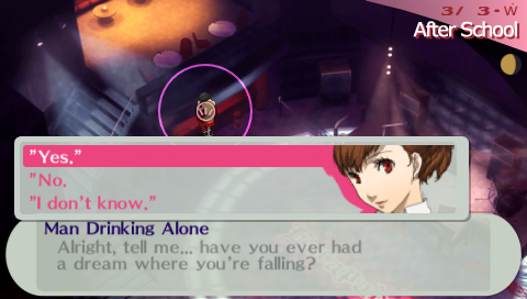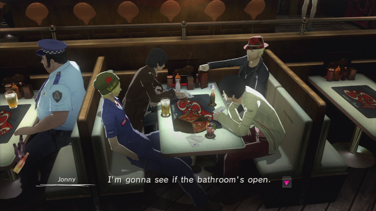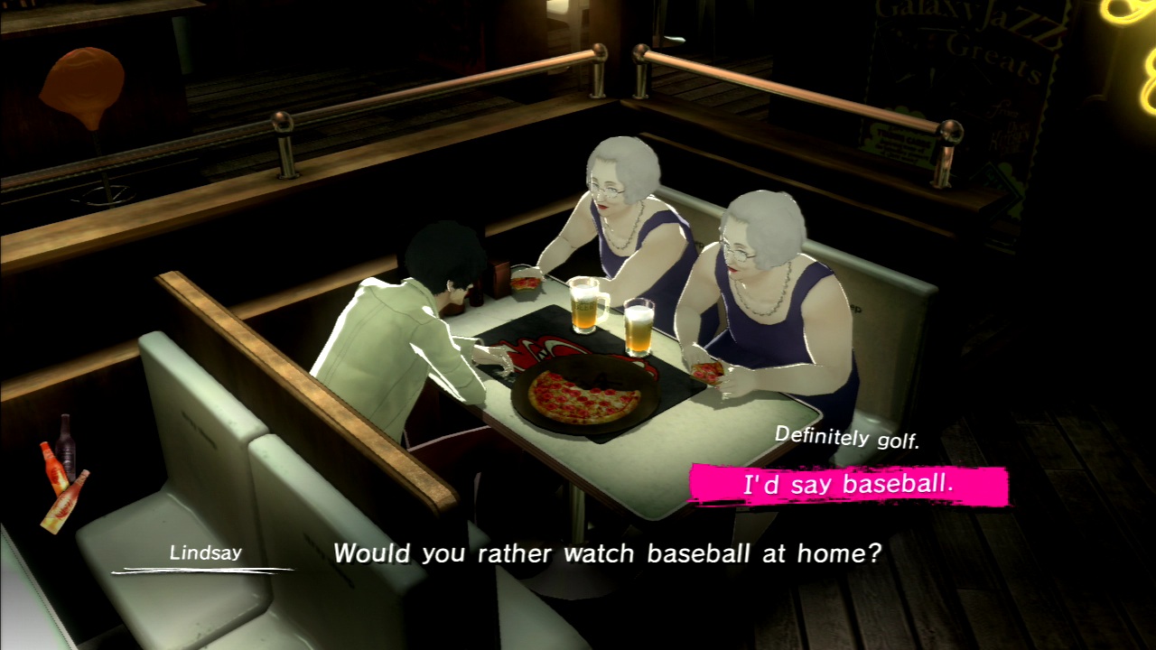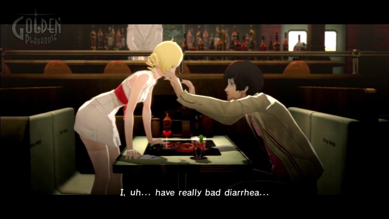 Compared to the events in his nightmares, Vincent’s time at the Stray Sheep is significantly more relaxing. Here, Vincent can talk to his friends; have a drink or three; play some Rapunzel, an arcade game modeled after the Nightmare stages but with a slightly modified ruleset; send text messages to both of the women in his life (their choppy composition making him sound drunk at any point in the night); and engage in all sorts of other activities. The broad picture is meant to reinforce the existential motif that every decision you make matters, no matter how minor it may be. Yet it’s a message the game bungles, considering both the decision to make certain activities not pass time and the specific choice of those activities (drinking, oddly enough).
