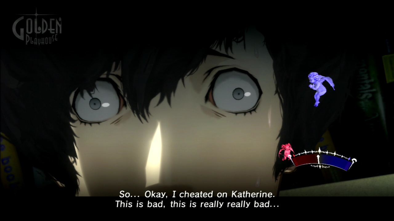 Yet disempowerment aside, these differences don’t go much deeper than the surface. Catherine isn’t concerned with extramarital affairs as an end in themselves, but because of the larger issues they allow the writers to explore. Moreover, those issues they explore find precedent in the team’s earlier works. Where Persona 3 deals with the struggle of relating to others and Persona 4 explores people’s tendency to flee from their own individuality, Catherine weaves both threads into its own thematic tapestry.