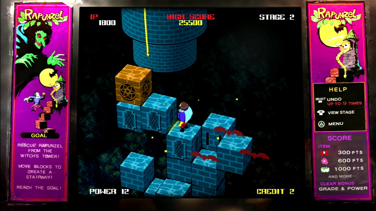 Incidentally, there’s also an arcade game-within-a-game called Rapunzel, which is exactly like the core game but presented with old school (though still 3D aesthetics). Though there’s no time limit, the puzzles themselves are actually much harder, so it’s a more “classic” take on the core mechanics of the game.