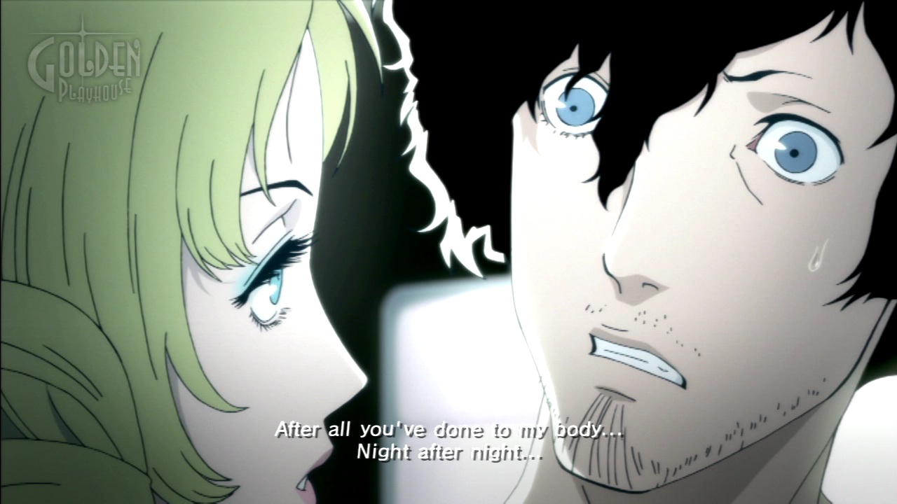 Yet at least in the beginning, Catherine‘s appeal was meant to derive from its narrative. This was where the team’s efforts were their most concentrated: the narrative premise formed the core around which the rest of the game was built, and the abundance of anime cutscenes produced by Studio 4°C to convey that narrative.