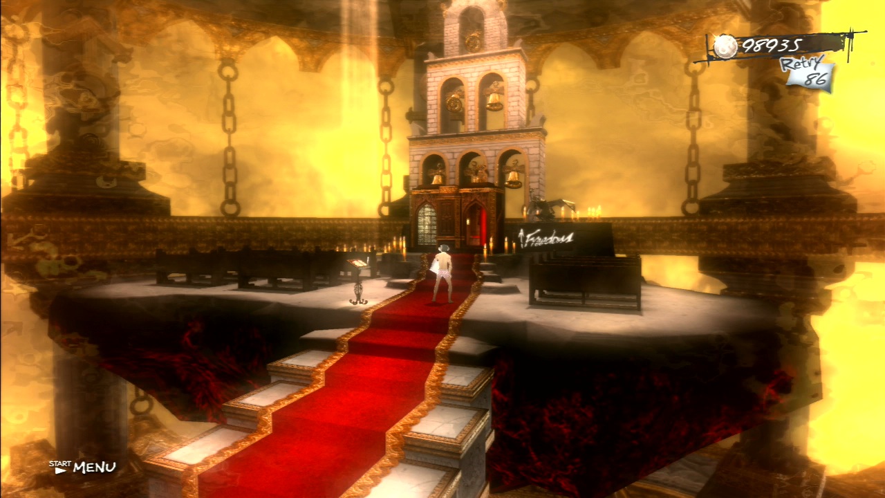 From a pure gameplay perspective, these nightmares are what the game uses to present the block puzzle gameplay. But from a narrative perspective, this is where Catherine most clearly shows its Persona influences, and where the two stories most diverge. The parallels between Vincent’s nightmares and something like the Midnight Channel should be obvious to fans of Atlus: for some this otherworldly realm is a rumor, but for others, it’s all too real. Dense with symbolism on multiple levels (religious, sexual, social/economic, poetic), the dream world lays bare the logic of Vincent’s life, forcing him to confront the personal issues he would rather run away from.