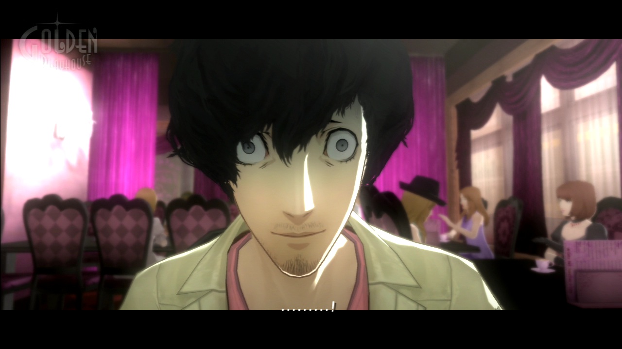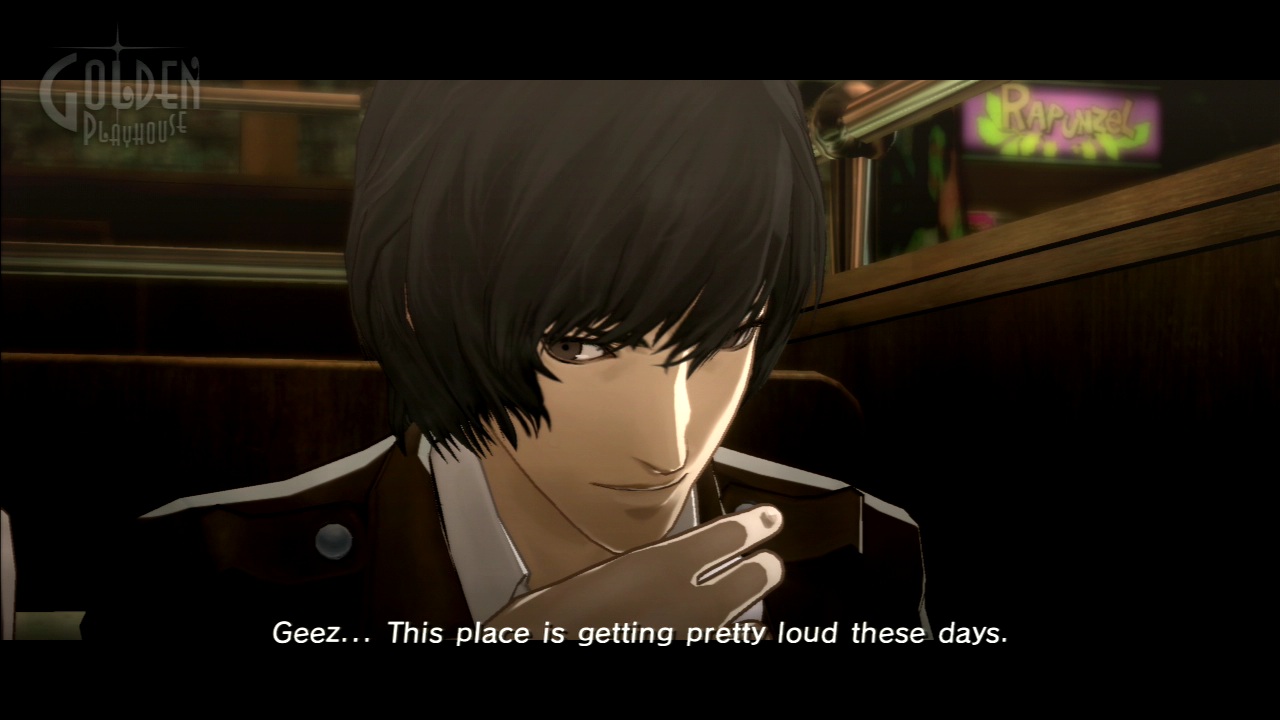 But the most prevalent and most obvious form of engaging with Catherine isn’t pushing blocks or talking to people; it’s the complete lack of interaction. Most of the game experience consists of watching events unfold before you through cutscenes. Catherine strongly presents itself as a stage production, borrowing from several schools of thought to achieve this – a bit of the problem play here, a bit of existential theater there, all of it presented through a film noir lens – but the effect should be clear to anybody playing. From an aesthetic standpoint, these influences imbue the game with a stylish and distinctive quality. The character models look much like the Persona games, and the soundtrack is mostly riffs on classical music but is distinctly in the style of Shoji Meguro.