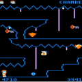 On the surface, Cave Walker resembles Downland, but on top of the screen is an upgraded status bar. The long bar on the far left is your life bar, and the short bar in the center shows you which position your joystick is currently in. As the joystick acts like an analog stick this time around, the further you have it in either the right or left positions is reflected on the bar, which shows you how far you’ll jump. There are also a row of icons that shows you how many of each item that you’re carrying. There are three different types of keys, bags of gold (represented by the dashes in the status bar), umbrellas (which will save you from a fatal fall), rings (which protect you from the Great White Bat) and flasks (which will protect you from fireballs or refill your life when it runs out) among them. There are also one-use items including bread (which help replenish your life), locks (which will open up new passages and make hidden doors visible), crowns (which give you an extra life), diamonds and gold bars (both of which give you two bags of gold).