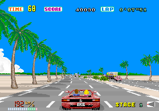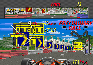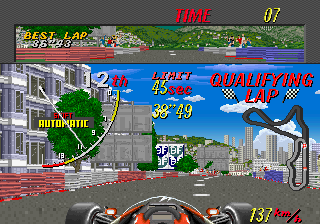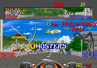Historically, the most interesting thing about Super Monaco GP is the lawsuit it attracted. Many other Sega racing games (and Japanese media in general) like to feature “off-brand” advertisements that look like real products, but have slightly different names or are intentionally misspelled. In the case of Super Monaco GP, one of these was for Marlboro, which appeared in the game using the same red and white color scheme, but spelled “Marlbobo”. It was also featured on the title screen – technically, the letters are covered so you can’t make out the full logo, but it’s pretty obvious what it was.