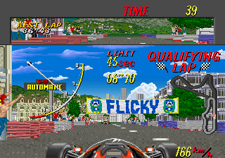 During the late 1980s, there was significant criticism over the use of cigarette advertisements potentially targeting children. The result was regulation over where cigarette companies could be advertised, as well as the retirement of Joe Camel, the cartoon-like mascot for Camel cigarettes. Some advocacy groups noticed the Marlboro-like logos in Super Monaco GP, which in turn alerted Phillip Morris, owner of the Marlboro brand, to Sega’s game. With the federal government already breathing down their necks, they didn’t appreciate being featured in an arcade game, which were seen as being marketed toward kids. They filed a copyright infringement lawsuit, which resulted in Sega distributing updated ROMs for arcade owners which removed the infringing logos. Beyond changing the title screen, many other logos that bore resemblance to real products, including Pirelli tires and Foster’s beer, were also removed, probably just to be on the safe side. The banners were subsequently changed to advertise Flicky, referencing one of Sega’s other arcade games. However, for the other logos, it seems like Sega just changed some color palettes, and traces of the old designs can still be seen if you look closely enough.