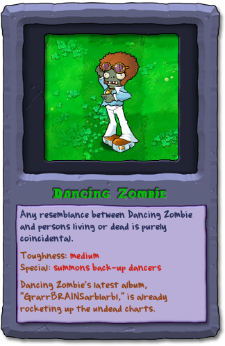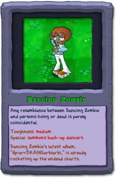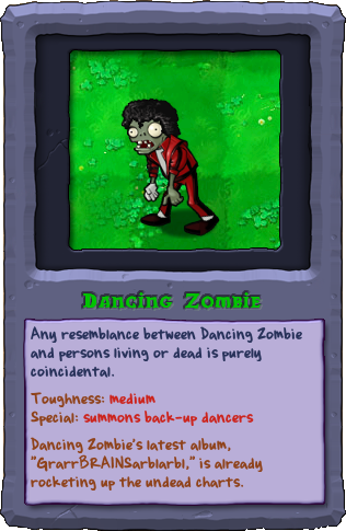 In the original release of Plants vs. Zombies, the Dancing Zombie enemy was based on Michael Jackson from the “Thriller” music video. Jackson’s estate complained, and so it was changed to a more generic looking disco zombie.