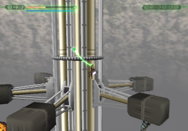 Despite being a 3D game, all of the action takes place along a 2D axis. The plasma chain works a little different than other games, though. All throughout the stages are little green orbs that act as grappling points. As long as you’re vaguely in the vicinity of one of those orbs, the hook will automatically shoot towards it as long as you’re pressing the button, even if it’s not visible on screen. The physics also work a little differently than other games with grappling hooks. Since your plasma chain acts like a slingshot, it’s important to keep up the momentum and travel quickly. You can also hang on the orbs and twirl around in 360 degree circles, which is good for taking a stand against large numbers of enemies.