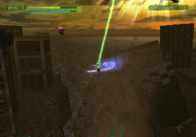Yet, at times it can look attractive. There’s a lot of visual variety to the game, ranging from post-apocalyptic cities, to alien landscapes, to mountain ranges to ancient, floating, Roman-esque ruins. Easily the most impressive stage is where you’re riding on top of an airplane as you protect it from smaller creatures. The chaos regularly sends it tilting back and forth, as you scramble for something to hold on to. The boss battles are equally as impressive due to their sheer size and scale. The design of the setpieces most definitely overshadows any technical deficiencies the game might otherwise have.