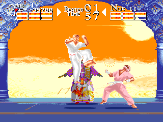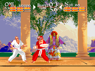 Curiously, The Karate Tournament was made by the Mitchell Corporation, the only known fighting game by what is essentially a splinter faction of Capcom, formed by several of its ex-employees. In fact, its project leader was Kouichi Yotsui, better known as Isuke, the creator of Strider, one of Capcom’s most beloved arcade hits. Isuke would go on to make Osman / Cannon Dancer, essentially his own non-infringing Strider game. In contrast, The Karate Tournamentdoes not feel like a clone of Street Fighter II, but it instead opts for a slightly (remember this modifier) more realistic take on fighters that hearkens back to Karate Champ. You play as a karateka with a white gi, or black if you’re player two. This is the only actual character you get, so if you’re spoiled by having at least six selectable fighters on the roster, you may not favor this game.