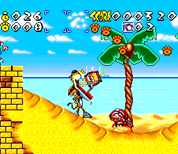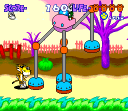The game does have a noteable obsession/fetish with sunglasses. Everything (sans Eugene and his dog) are wearing them. Even the rocks in the background have them, and by all rights, they shouldn’t even have eyes. There’s even a sunglasses power-up, which is remarkably redundant, seeing how Chester already has a pair on. Instead of causing our hero to stumble around in darkness caused by wearing two pair of sunglasses, it causes hidden items to appear. Throughout the levels you’ll see coin-like paw icons. These icons don’t grant any real rewards beyond giving you extra post-level points. The requisite invincibility item is an electric guitar, with one major snag – you can’t actually control your character when invincible. Instead Chester does a “totally wicked guitar solo” while prancing and dancing around, forwards and backwards before returning to the original spot. What an outrageous dude! There is, of course, one guitar precariously positioned by a ledge, which will send dear Chester rocking and partying to his doom.