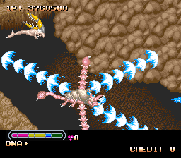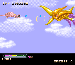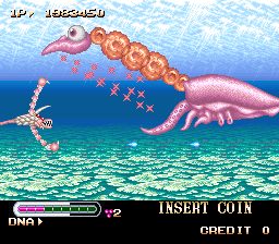 It certainly took a good deal of sprite work to physically change your Eater for each significant evolution. You can have a body full of spikes or coated in a hard shell, a slim double-pronged tail or a really fat one resembling a wasp stinger, large pincer arms that jut out of your sides, and little Eater children that act like Gradius options. Your main means of attack becomes stronger as you grow, but you’ll still want to throw out your mouth as much as possible, and it really hurts bosses to use your main fire in tandem with jaw attacks. Said bosses look incredibly awesome, including twin eel creatures, a big pink one-eyed squid, a freakish bird which is mostly a giant head and beak, and a gargantuan crocodile head with five eyes. Once you beat the badass lion wolf at the end of the mammal stage, where else is there to go? Well, the game’s tone takes a turn for the grim when the penultimate stage is “Mankind,” and you tear up a city during what seems to be some sort of nuclear winter. By this point, you’ve become a kaiju and human defense forces attempt to take you down with tanks, jets, and big guns. You can’t grow by eating machines, only from consuming the humans that fly out of them after destruction. If you survive the gauntlet of guns, the “boss” is anticlimactic but dramatic, where you blow up a nuclear reactor and take the entire city with it.