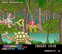 Forgive the Lovecraftian last couple sentences, but the premise of Chimera Beast is essentially a cosmic horror story where you actually PLAY as the eldritch atrocity instead of fighting against it or being driven insane by its mere presence. On a planet that’s like Earth but not actually it, evolution has somehow managed to form the Eaters, chaotic evil lifeforms which know no other purpose than to consume and assimilate everything in existence. You play as an Eater, a disgusting flesh-colored jagged-teeth multi-eyed flying monster with ambition and an abnormally abiding appetite. The premise of the game is thus quite simple: Consume and obliterate everything that moves. This sets you across seven stages of airborne chaos that actually follows a unique theme of biological nature. Your Eater starts out amongst microbes before growing up to eat fish, then birds, reptiles, and mammals. There are two more levels to come after, but those deserve special focus for later.