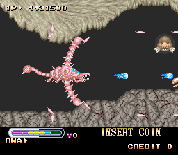 The Eater’s growth isn’t just a story gimmick, but it’s also Chimera Beast‘s defining gameplay trait. You have your typical fire button which can be held to deliver a charge attack, but your alternate fire button sends out the Eater’s mouth to gulp up whatever is in front of it. Not only do your jaws deal considerable damage, but in a mechanic somewhat akin to Gaiares on the Genesis, eating enough enemies makes you stronger and gives you new abilities. Your lifebar (a rarity for the genre) can increase to a potential of nine notches, and your Eater grows if it gets high enough, making it harder to dodge attacks. Conversely, you shrink if it drops to the red, making things a little fairer when it gets too rough. Still, you’ll want to grow big and assimilate your foes, where your powers are vaguely akin to how the enemies attack or look. For instance, these googly-eyed blobs in the first stage give the Eater an entire body full of eyes that manifests as a powerful charge attack, where the eyes pop out of your body and home in on enemies.
