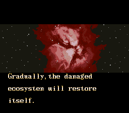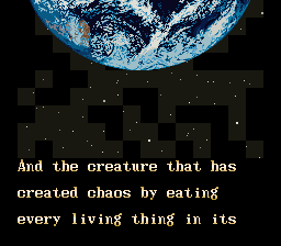 The final stage, “Catastrophe,” takes place within the atomic blast as many other Eaters attempt to prove their superiority and take you out. You get to destroy a space shuttle in order to snuff out humanity’s last hope of fleeing their Eater-ravaged home planet, and the super-tough final battle is against a colossal Eater who shares some of your attacks and has several others which you don’t. You need to take out its many eyes (what is it with this game and multiple eyes anyway?) to kill it, and the resulting ending says that you go on a cosmic eating spree and eventually work your way to Earth. This is called the “Bad Ending,” but if you decide to not continue when fighting the final boss, you’re instead told that the Eaters eventually take themselves out and the ecosystem has a chance of being restored. This is called the “Good Ending,” but the “Bad Ending” is the only one that gets you the credit roll! You’re the villain, after all, so why should you end the game on an unsatisfying positive note?