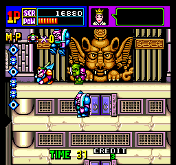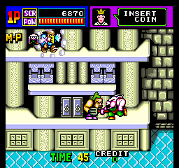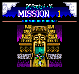 Taking on the role of Gocoo (Son Goku) the monkey king, Hakai (Cho Hakkai) the pig, and Gojoe (Sa Gojo) the kappa, each of the game’s five stages takes place in a tower, several stories high. (Sanzo is shown on the top of the character select screen, but isn’t actually playable.) There are three buttons here — attack, jump, and a special magic technique, which are obtained in limited quantities by defeated enemies. All three characters share the same basic movement, but employ their own unique weapons. Even though it doesn’t use an isometric perspective as in belt-scrolling games like Double Dragon, it unquestionably plays like a beat‑em-up, right down to the hit stuns and combo attacks.