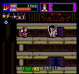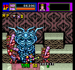 You’ll need to use every option at your disposal too, as China Gate is pretty tough, even in two-player simultaneous mode. The basic enemies on the first two stages aren’t too bad, but the bosses prove to be quite troublesome. Directly attacking them leaves you open to counters, so you’ll need to figure out their patterns and weak spots to keep them at bay. This is particularly tough on the third boss, Ravana, based on the multi-armed Hindu god, who will electrocute you upon making contact and shoots lightning bolts whenever you’re far away. An even harder variation, Neo Ravana, appears as the final boss, and this iteration even shoots out his arms. It also refuses to die, as its brain will emerge from its decapitated head to torment you one last time before you’re able to see the ending.