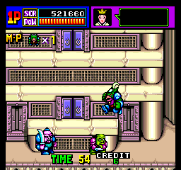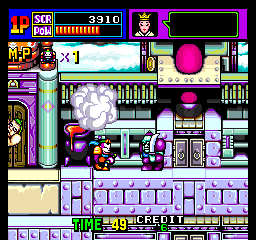 Even though each stage has a tower, you actually don’t need to climb it at all. In fact, you can stay on the bottom floor until you’ve disposed of enough enemies for the boss to arrive. You can use the floors to your advantage however, dropping above or below foes to avoid their attacks and then surprise them from behind. Proper positioning is quite important! While you can scale up or down by jumping, if you’re knocked off of a high floor, you’ll automatically ride onto a floating cloud and can fly to any point on the screen, and without any additional life penalty. This is certainly a welcome technique, as it lets you reposition yourself easily.