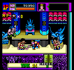 The game still has an appeal to it though, one that marks it as a distinctly Technos game. All of the sprites are rendered as diminutive, squat figures, similar to the Bikkuriman stickers that were popular in Japan at the time. The difference here is that instead of cute characters, everyone looks like ugly demons, even the heroes.