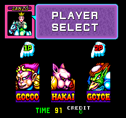 Defeated enemies can also drop two types of magic spell orbs, weak and strong. This is where the characters differ, as each has their own unique magic spells. Gocoo unleashes a mini duplicate of himself in his weak attack, while shooting out four-way projectiles for his strong spell; Hakai can toss fireballs or summon enormous weights to drop on enemies; and Gojoe has an electric ball as well as a lightning attack.