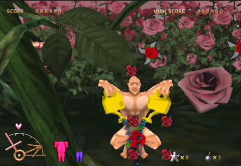 The graphics are completely terrible, low budget 3D, though given the intentional badness of the series, the totally amateurish look may be intentional. The music is somewhat dull compared to previous games, and the excessive sound effects are quite annoying. The early stages lack the imaginative craziness we’ve come to expect from the series, but it picks up as you get further. This time around you’ll find a Mona Lisa that fires lasers out of its eyes, a statue that pisses lava, a tribute (??) to Alice in Wonderland in form of an agitated crossdresser, and an incredibly ugly nekomimi (cat ears) maid. The most amusing parts are the insanely silly paintings in between levels, and the gloriously silly intro, which is animated with the same professionalism as Aqua Teen Hunger Force and features a rocking song about “pumping it up”. While it’s not as wacky as Ai Cho Aniki, it’s probably the most well-balanced and playable of the series.
