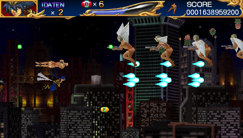 You once again play as Idaten and Benten, like the original, although each of them has different option types – Idaten has Adon and Samson, while Benten has two creepy angels called Mika and Eru. (Combined together, they’re supposed to spell “Michael” in Japanese kana.) There’s also a third unlockable character, an elephant man named Shouten. Each character has their standard rapid fire weapon, as well as a limited supply of bombs. The Men’s Beam from some of the other games returns too. Fallen enemies will drop little colored muscle men that add to your score, which reaches into the trillions.