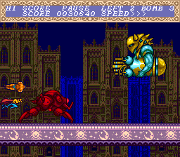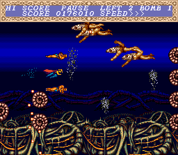 For the most part, Cho Aniki is your normal side-scrolling 16-bit shooter. You only have one primary weapon, which can be strengthened through powers-ups. Each character also has a special attack which is unleashed when releasing the fire trigger – Idaten has a powerful laser while Benten has a spread attack. Both are armed with the usual screen clearing bombs as well. While Cho Aniki is not an overly difficult game, getting killed will send you back to a checkpoint.
