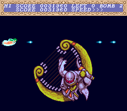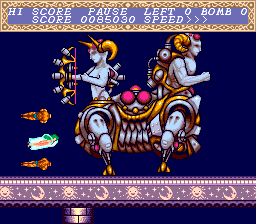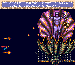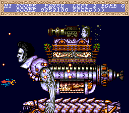 So if this is such standard stuff, what really sets this game apart? While the levels themselves are pretty sparsely populated, Cho Aniki has some of the most bizarre, messed up sprites ever seen in a shooter. This is before the series got too obsessed with scantily clad macho men – what you fight here are mostly strange mechanical creations melded with human features. The Zombie Elvis spaceship (known as “Sabu”) raises so many questions by itself.