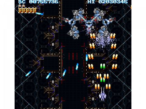 Cho Ren Sha is fairly long for a vertical shooter. The game lasts for seven decently sized stages and two loops (interestingly, the explosion from which the player’s ship emerges at the beginning of stage 1 is triggered by the destruction of the first loop’s last boss), followed by a true final boss. After that it returns to the title screen, from where two even harder loops can be accessed by using the continue option. This way, expert players can go as far as loop 8 before the game comes back to the first one.