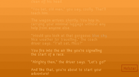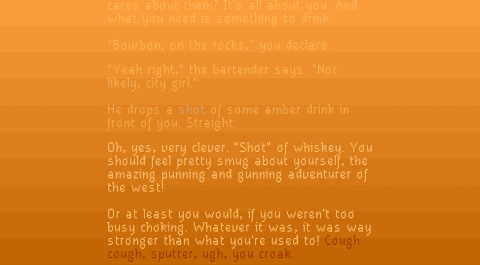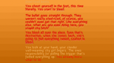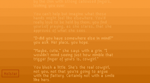 The game’s mechanic to move the story forward is surprisingly involved and creative. Instead of clicking on an option to move along the story, you drag your cursor on red words, triggering a gunshot sound and unlocking a new set of text. It’s fun at first, but it becomes very easy to shoot off at the wrong targets if you’re not paying close attention. That fits the story perfectly around the time the other cowgirl enters, as the main character becomes flustered and starts doing very stupid things.